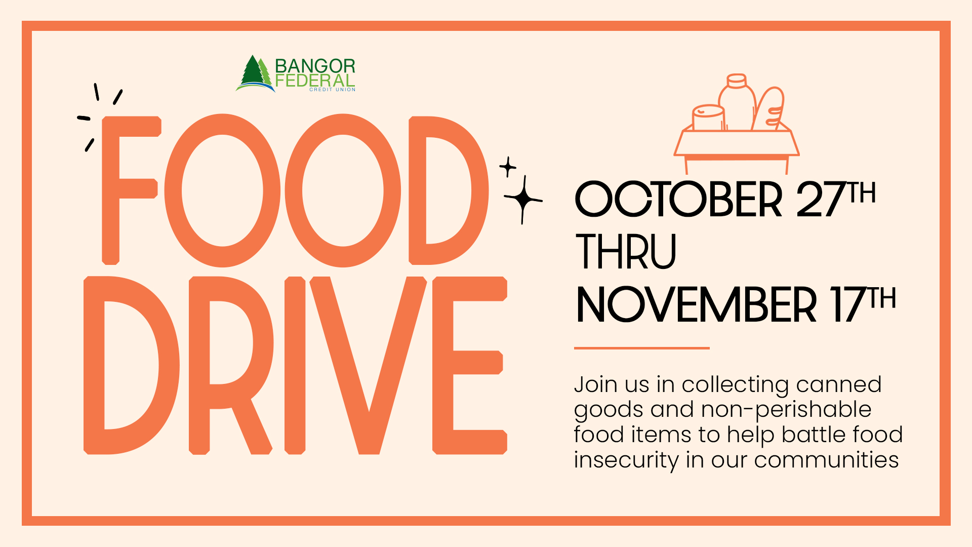 The need grows every year as food pantries and organizations struggle to meet the rising demand for food services. This year, that need very well may be exacerbated by the continuing government shutdown which will impact nearly 170,000 Mainers who receive SNAP benefits. To help alleviate this increased demand and provide for those struggling with food insecurity with the holiday season approaching fast, Bangor Federal Credit Union invites its members, and its community, to join us in collecting canned goods and non-perishable food items to combat this need in our backyards.