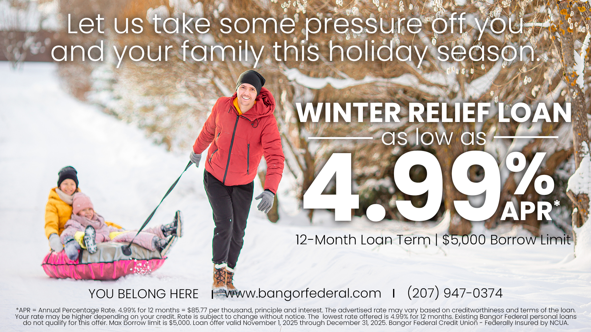 It’s no secret – your dollar doesn’t stretch as far as it used to. Let the team at Bangor Federal Credit Union take some pressure off you and your family this holiday season with our Winter Relief loan.